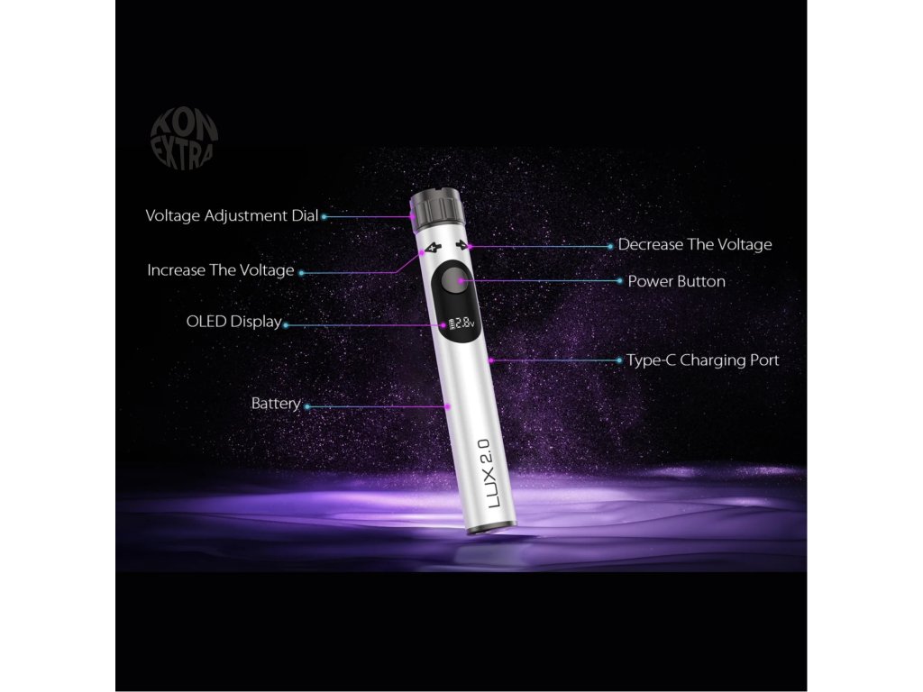 Yocan Lux 2.0 je moderní baterie se závitem 510, která navazuje na úspěšný předchozí model a přináší přesnější nastavení napětí, OLED displej a rychlé nabíjení přes USB-C. Díky kompaktnímu provedení ve stylu pera je ideální pro každodenní použití doma i na cestách.